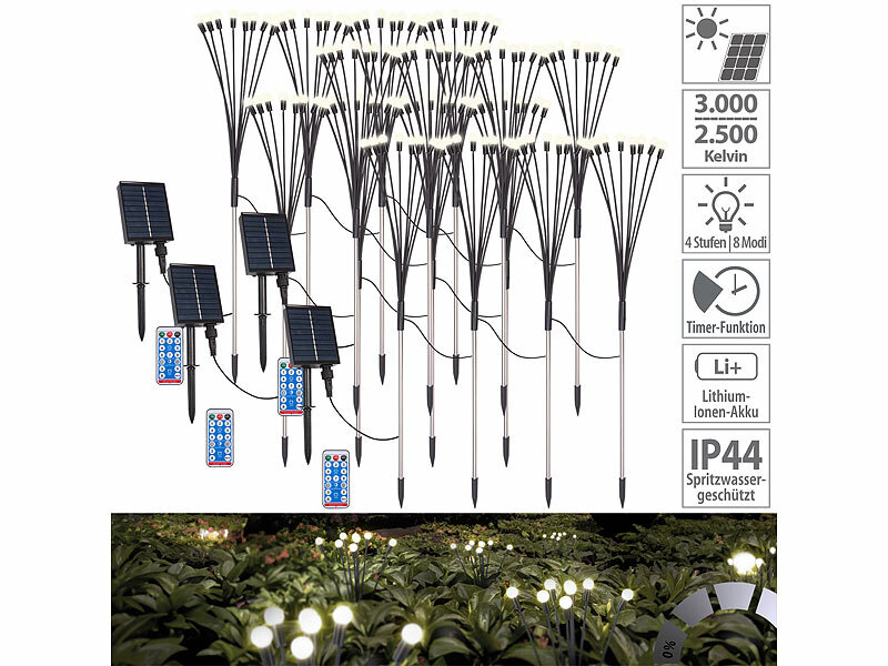 Romantische Licht-Tupfen für Ihren Garten: Jetzt schweben Glühwürmchen durch Ihren Garten, wann immer Sie möchten. Stecken Sie die insgesamt 16 Lichtstäbe einfach per Erdspieß in Ihre Beete oder auf die Wiese und richten Sie die insgesamt 128 LEDs aus. Schon ist die Illusion perfekt.Verschiedene Leucht-Modi: Die warmweißen LED-Lämpchen leuchten auf gleich 8 verschiedene Arten - von Dauerleuchten bis Flackerlicht. Wählen Sie einfach Ihren Lieblings-Lichteffekt.