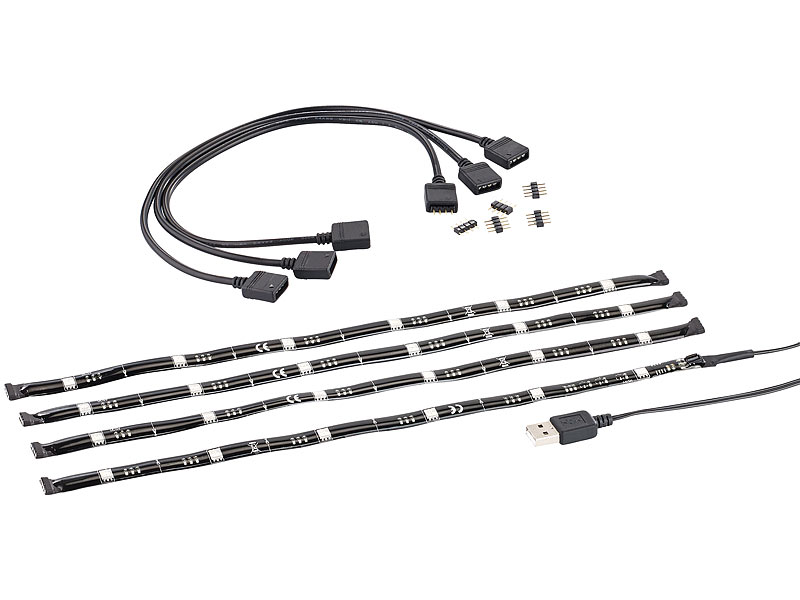 - 4 LED-Leisten inklusive 3 Verbinden, USB-Anschlusskabel, Fernbedienung mit Knopfzelle (CR2025) und deutscher Anleitung