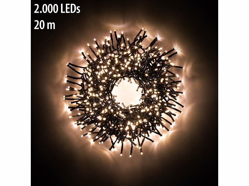 Setzen Sie glanzvolle Lichtakzente: Ganze 2.000 LEDs auf 18 Metern Länge sorgen für angenehm warmweißes Licht. Wählen Sie aus 8 Leuchtmodi den passenden für Ihren Zweck - ob Dauerleuchten für den gemütlichen Grillabend oder wild blinkend für die Geburtstags-Party.Ein Highlight für innen und außen: Ihre Lichter-Dekoration ist spritzwassergeschützt. So verschönern Sie auch Balkon, Terrasse oder geschützte Bereiche in Ihrem Garten.