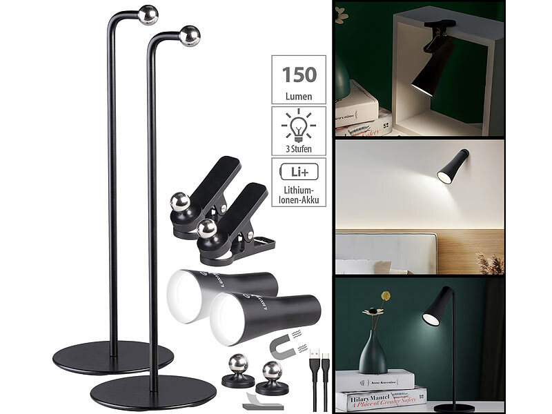 - 2x 4in1-Akku-Lampe jeweils inklusive magnetischer Tisch-, Wand- und Klemmhalterung, USB-C-Ladekabel und deutscher Anleitung