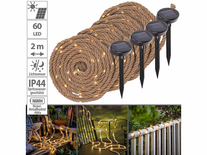Schöne Dekoration bei Tag und Nacht: Das 2 Meter lange Seil aus Naturfasern lässt sich einfach um Zäune, Geländer, Gartenbänke & Co. wickeln. Wenn es dunkel ist, sorgen 60 eingearbeitete, warmweiße LED-Lichter für eine stimmungsvolle Beleuchtung.Kostenlose Stromversorgung: Dank Akku und Solar-Modul ist das Seil völlig unabhängig von Stromquellen und wird mit Gratis-Strom aus Sonnenenergie betrieben.